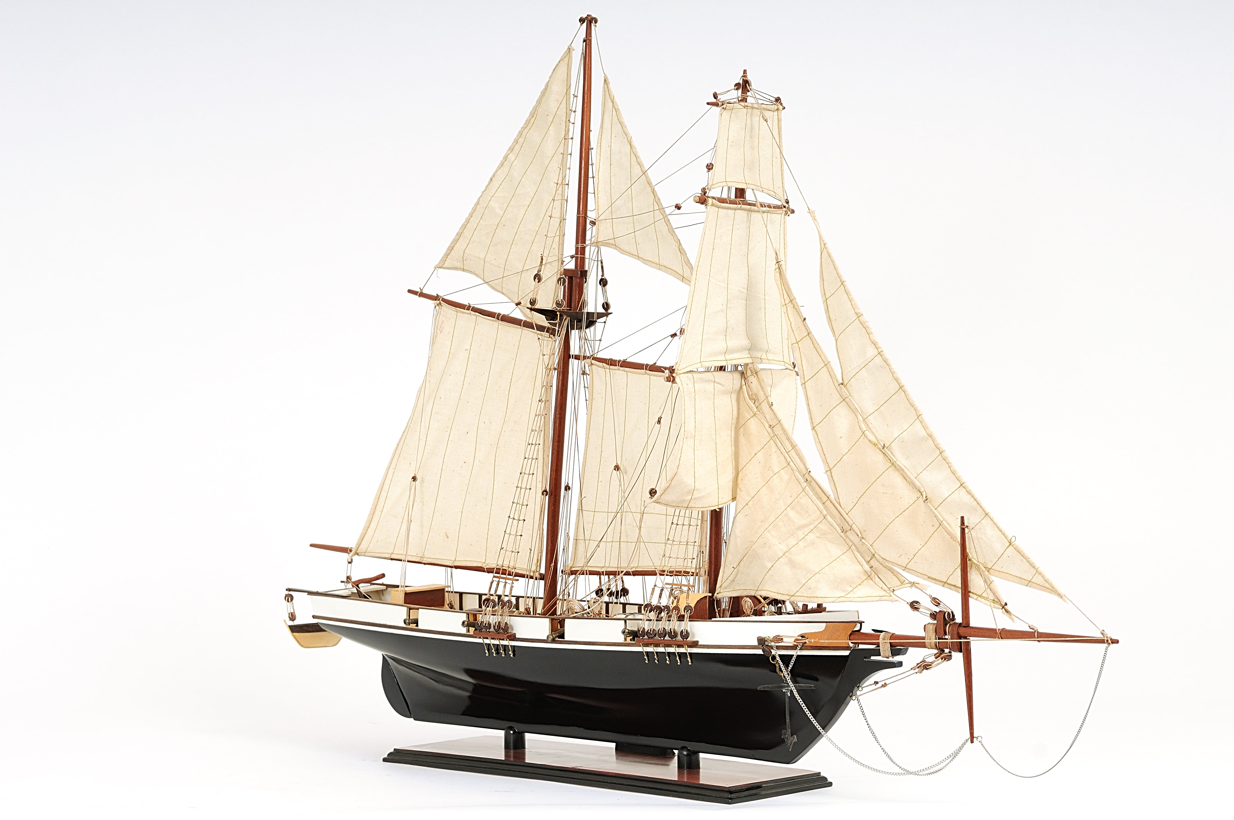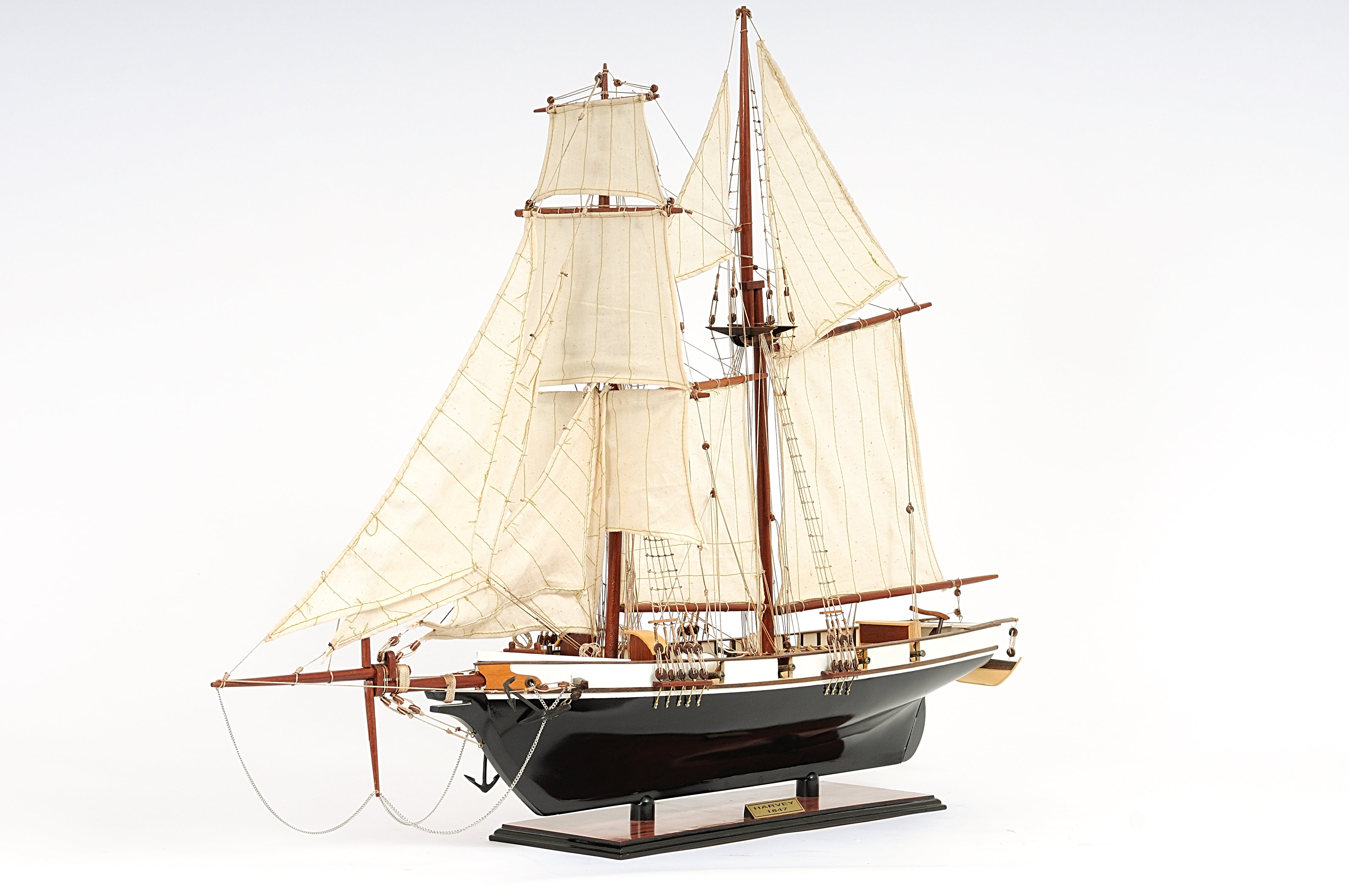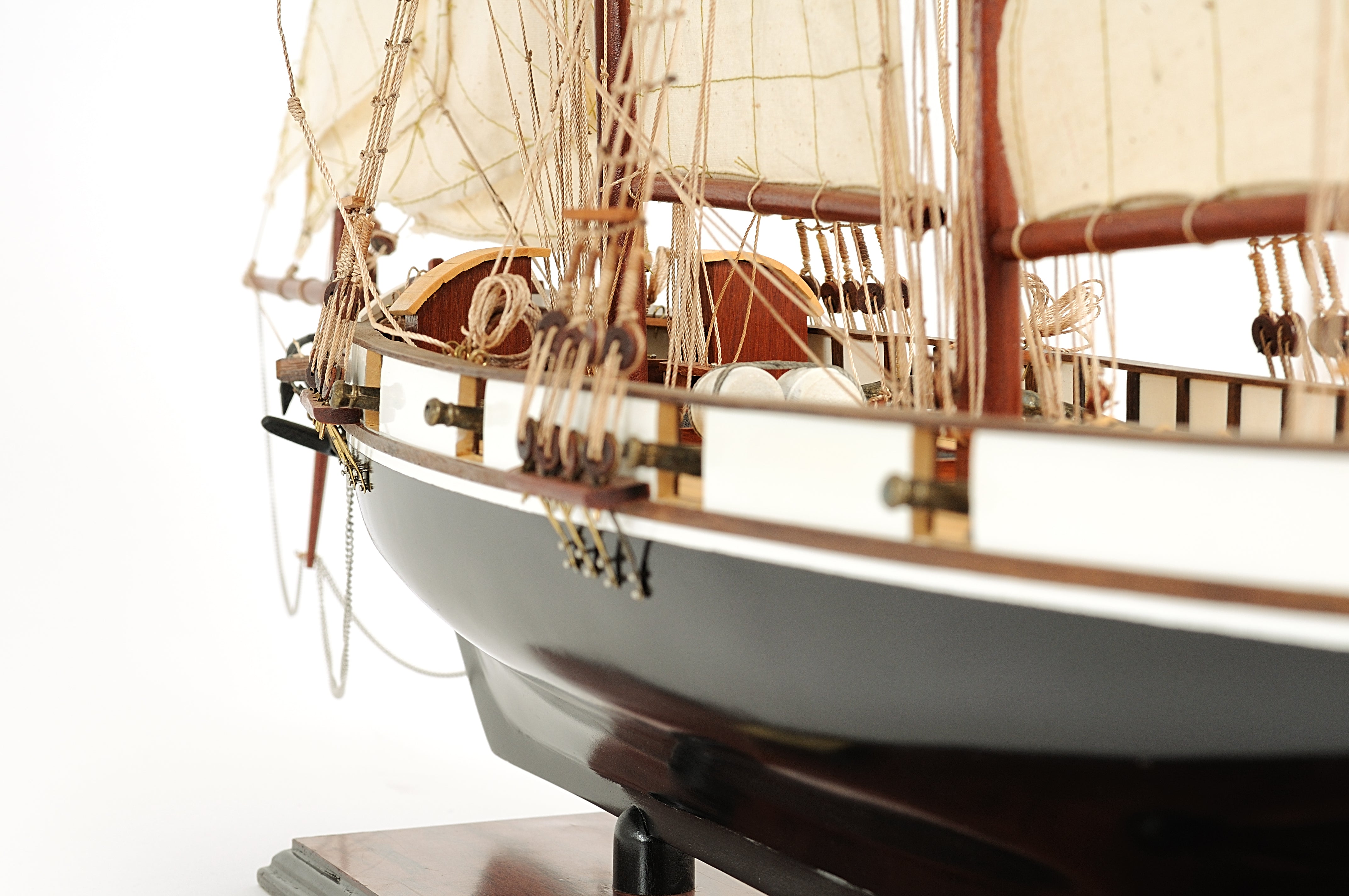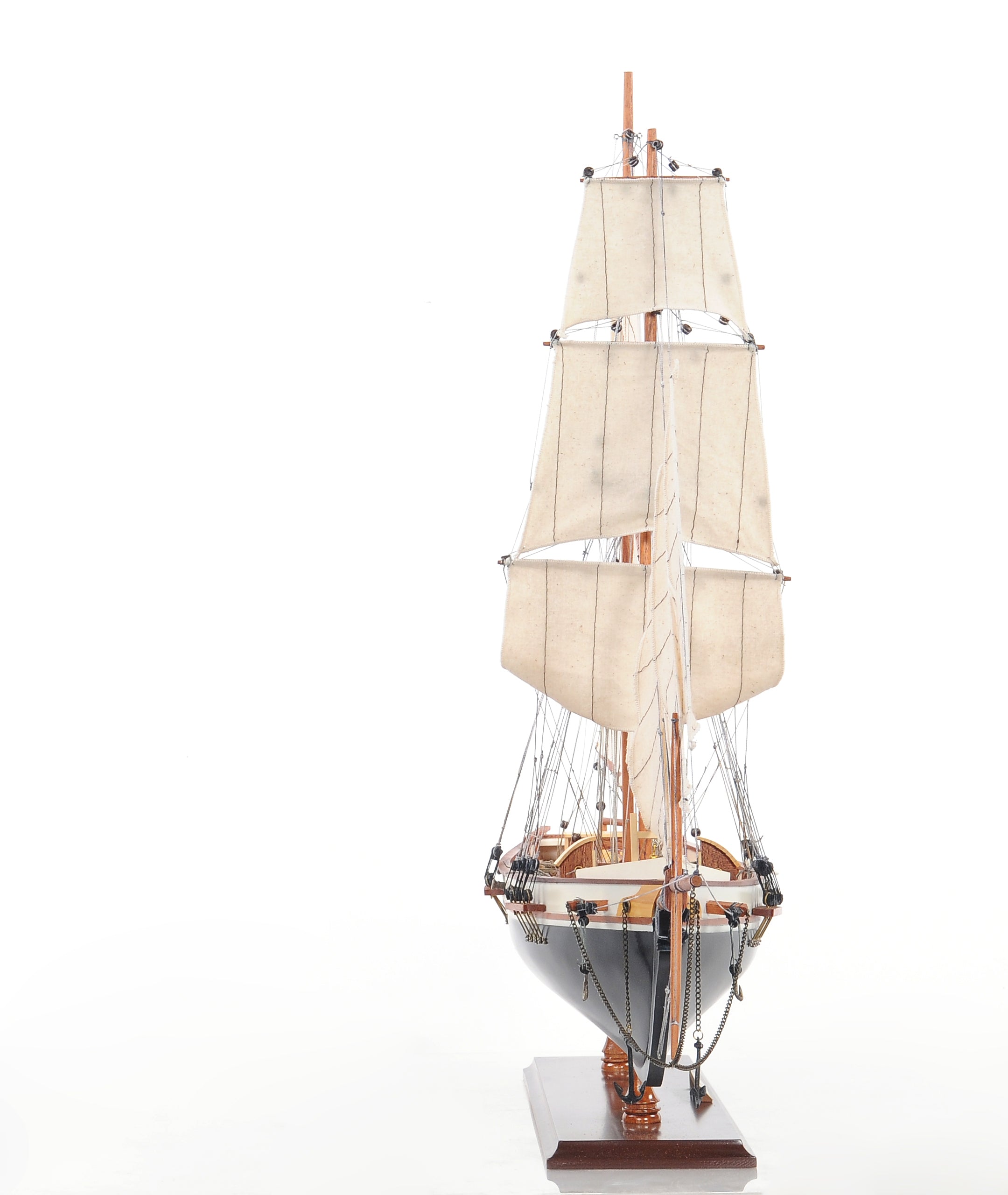 The Harvey was built in 1847 in the state of Maryland. She was an able sailer working out of the port of Galveston Texas. At the turn out the Century she was making several voyages a year between Galveston and the ancient Jewish port of Jaffa which at the time was still under the Ottaman empire. Her main cargo was hemp used to make ropes for the rigging of ships. She exemplified this class of roving privateers, overtaking and capturing British merchantmen laden with cargo to support the British expeditionary forces then attempting to recapture the former colonies. She had a successful career, first as a warrior and then as a cargo carrier. She displaced about 225 tons, and had a length of 97 feet, a width of 25 feet and a depth of less than 11 feet. With the end of the war, transatlantic trade resumed, and the Baltimore clipper evolved over the next 30 years to take the form of larger cargo carrying packets. These had similar hull lines and were longer, slimmer, and faster than older merchant ships.This is a high-quality, FULLY ASSEMBLED replica of the clipper that sailed out of the port of Galveston, Texas, in the mid-1800s. Master craftsmen using historical photographs, drawings or original plans meticulously handcraft these highly detailed wood models from scratch. They are built to scale with high-grade wood such as: western red cedar, rosewood, and mahogany. They are 100% hand built individually using plank-on-frame construction method and are similar to the building of actual ships. Each model requires hundreds of hours to finish and must go through a demanding quality control process before leaving the workshop. This beautiful Harvey model features: two tone painted black and white colors on the hull, plank on frame, and two decks. The front bowsprit and three large masts are connected securely using advanced rigging and lines painstakingly knotted and fastened by hand. Each yard has an attached hand-stitched unfurled sails made of fine linen. Metal anchors and a wooden rudder are visible on the front and rear of the ship. On the deck, there are metal stationed cannons, wooden windlass, bell tower, and many other spectacular ornaments. This model comes standard with a solid wood base and brass nameplate. It?ll make a perfect gift for home or office decorator, boat enthusiast or passionate collector.