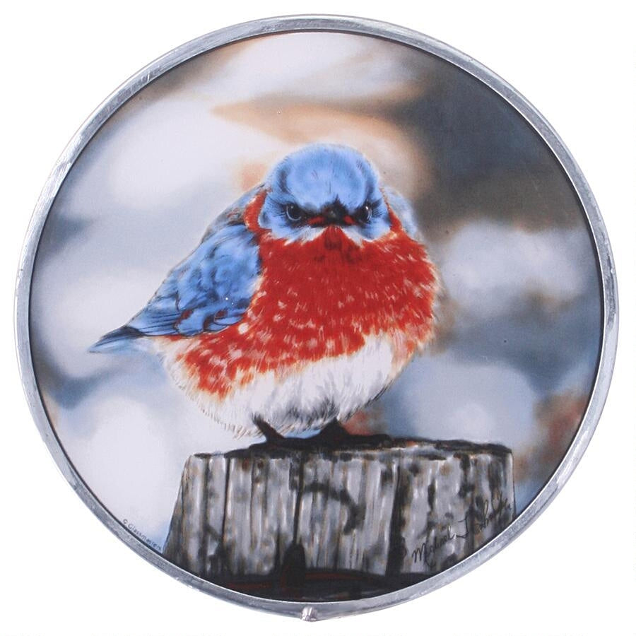 The original Inches;angry bird! Inches; One picture of a fluffy mad bluebird on a fence post changed worldwide renowned photographer Michael Smith life. More than twenty years later this sweet little fellow is still one of the most sought after images. remarkable roundel reproduction of this industrious bluebird will brighten up any room and light up any window. Art glass, also called stained glass, is created by a unique technique of fusing hand-rolled architectural glass with unique transparent enamels, then kiln fired at temperatures above 1100 degrees Fahrenheit so the colors actually becomes part of the glass. The shades and hues will stay bright and glowing with radiant color and provide a stunning view from either side. this art glass window is framed in zinc with a hanging chain for window display and a tabletop easel stand to enjoy this treasured piece in any room.6.5 Inches Dia. .5 lb.