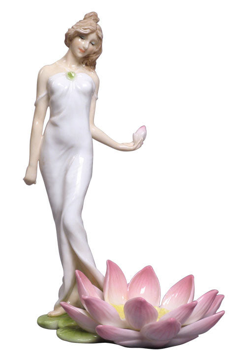 Bring the serene beauty of a lotus flower into your space with the elegant Women Standing by Tealight Candle Holder. Made from fine porcelain, this stunning piece showcases a graceful woman standing beside a delicately crafted pink lotus, enhanced with soft green accents. Light a tea light in the lotus-shaped holder and let the soft glow fill your surroundings with a sense of peace and elegance.