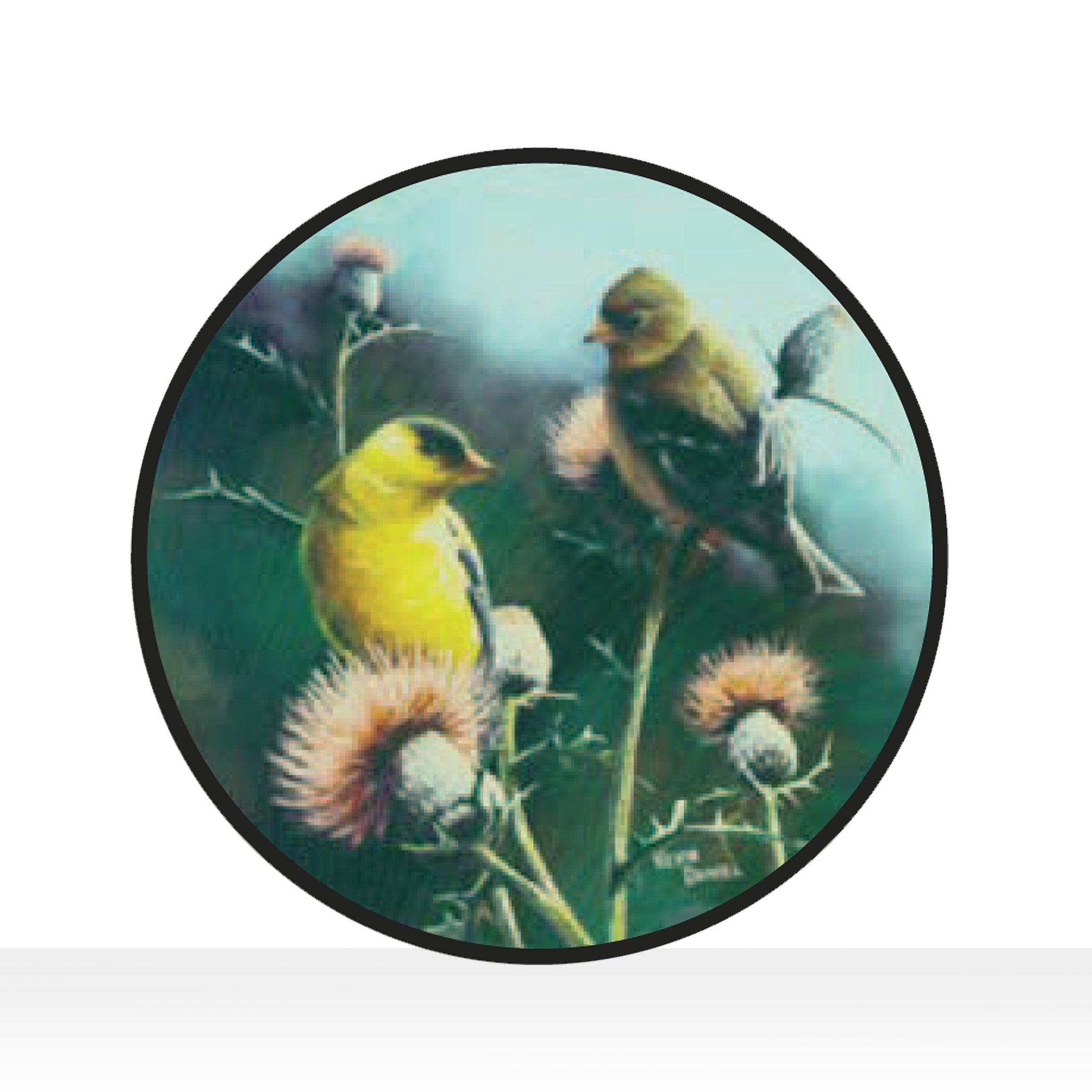 In this scene, we see the Goldfinches eating their favorite food, thistle seeds. The male is bright yellow and black. The female is dusty brown and black. Sometimes they visit gardens to eat the seeds of zinnias and other flowers. The finch is the state bird of Iowa, New Jersey and Washington.