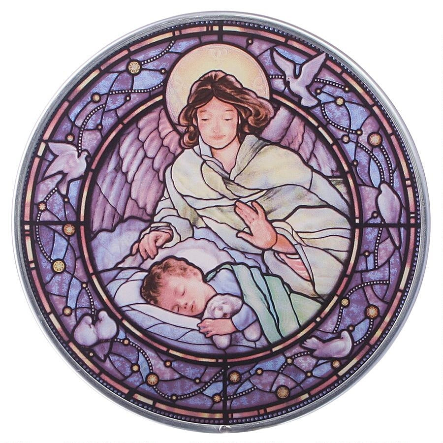 A gentle guardian angel, wings protectively extended, gazes lovingly over a precious sleeping little boy. Beautifully rendered by artist Randy Wollenmann in art glass, reminiscent of the great Cathedral windows, this charming jewel-tone roundel is surrounded by delightful renditions of doves representing peace, hope, love and devotion. Art glass, also called stained glass, is created by a unique technique of fusing hand-rolled architectural glass with unique transparent enamels, then kiln fired at temperatures above 1100 degrees Fahrenheit so the colors actually becomes part of the glass. The shades and hues will stay bright and glowing with radiant color and provide a stunning view from either side. this art glass window is framed in zinc with a hanging chain for window display and a tabletop easel stand to enjoy this treasured piece in any room.6.5 Inches Dia. .5 lb.